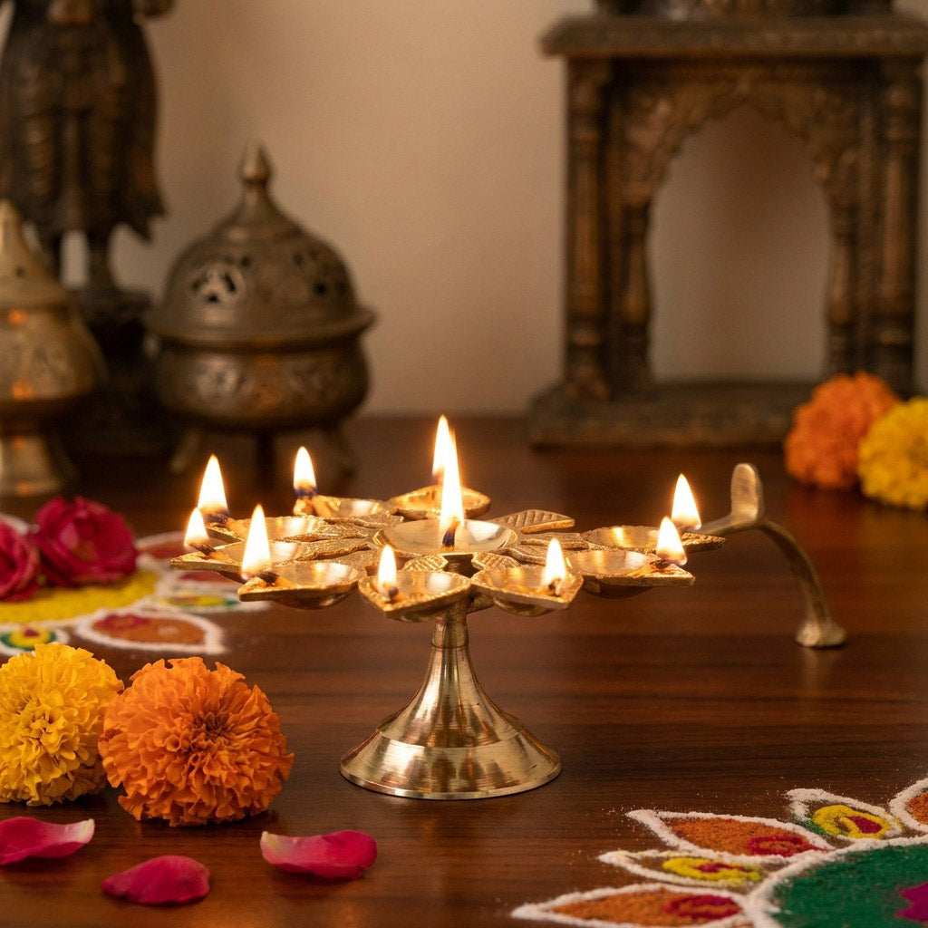 About Product: A beautifully engraved Brass 9 Mukhi Aarti Diya is an essential element for every pooja ritual. Designed with nine wicks, this traditional aarti diya is used with cotton wicks and oil or ghee during prayers and religious ceremonies. Lighting the diya marks the beginning of auspicious occasions and helps create a calm, pure, and spiritual atmosphere. Carefully handcrafted from high-quality brass, this 9 Mukhi Aarti Diya adds a touch of elegance to home temples and pooja spaces. It is perfect for daily worship, Diwali puja, and festive rituals, and also serves as a thoughtful Diwali gift or spiritual gift for family and loved ones.