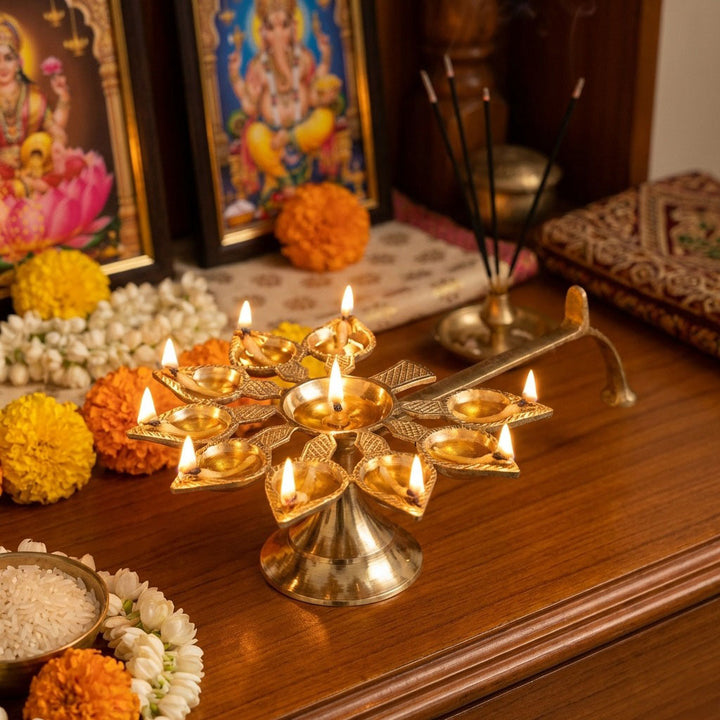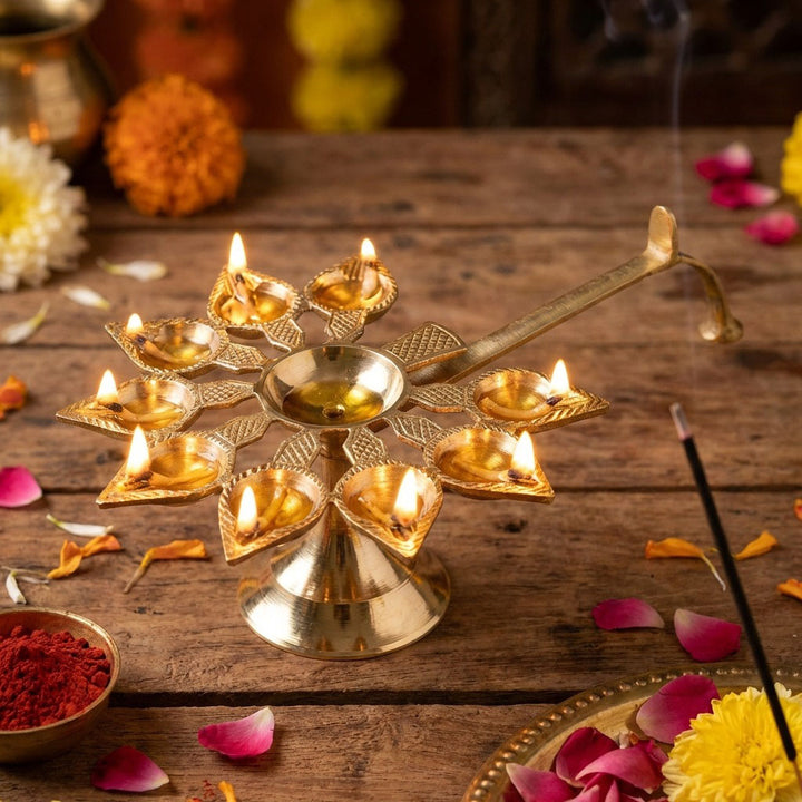 Buy Online | Brass 9 Mukhi Aarti Diya with Handle| Satvikstore.in – satvikstore.in