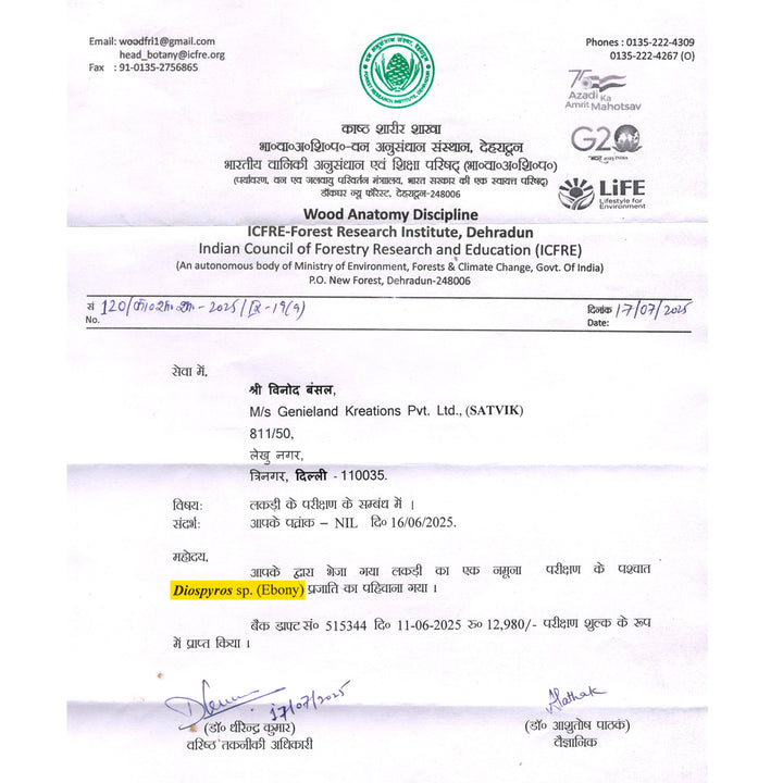 • Tested by:Β Authenticity certified by Central Wood Testing Laboratory, The Rubber Board (Ministry of Commerce & Industry, Govt. of India), and ICRE – Forest Research Institute, Dehradun – ensuring genuine Karungali wood quality.