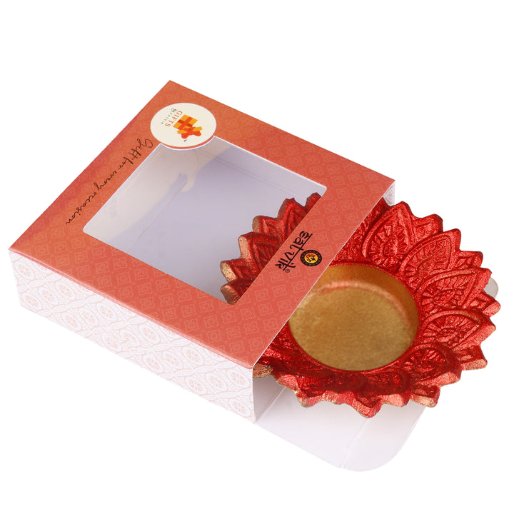 • Item Name: Set of 2 Pc Designer Red Floral Shape Metal Diya and 2 Pcs of Candle Tea Lights. Each Comes with Premium Gift Packing.