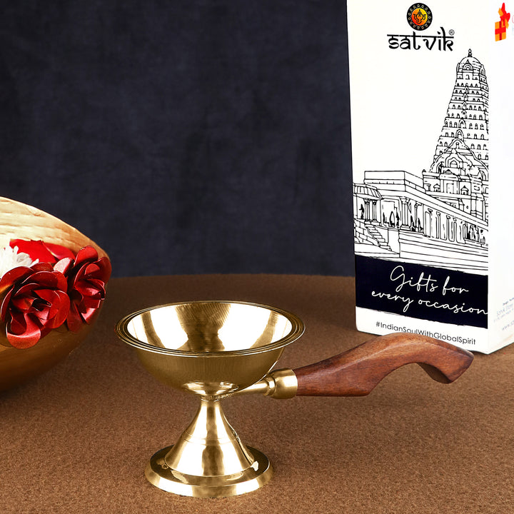 aarti diya with wooden handle | curved wooden handle diya | pooja lamp with handle | brass aarti lamp | traditional aarti diya | spiritual lighting | handmade brass diya | decorative pooja lamp | aarti ceremony diya | wooden handle diya |