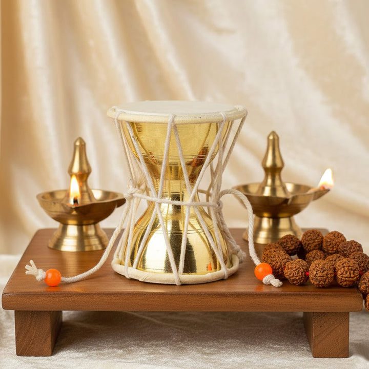 divine brass damru | brass damru for pooja | 4 inch pooja damru | compact damru for temple | damru for lord shiva | spiritual damru instrument | meditation damru | brass damaru | shiva damru for aarti | pooja accessories india