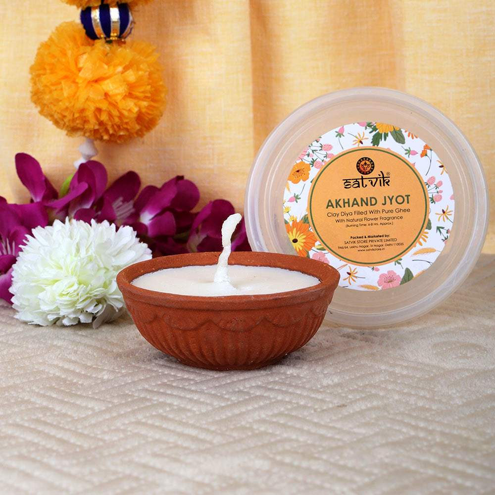About Product: Satvik Presents Akhand Jyot Clay Diya Pack of 1 Filled with Pure Ghee Wicks Tibetan Buddhist Butter Lamp With Natural Floral Fragrance 6 to 8 Hours Burning Time (Pack of 1)