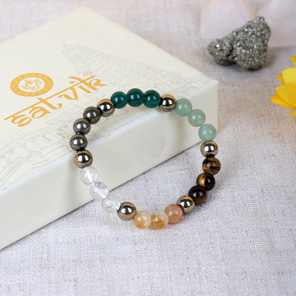 Energy Amplification – The Dhanyog Bracelet with Tiger Eye, Pyrite, Citrine, and Green Aventurine enhances the wealth-attracting energy of the 7 Horses Pyrite Frame.