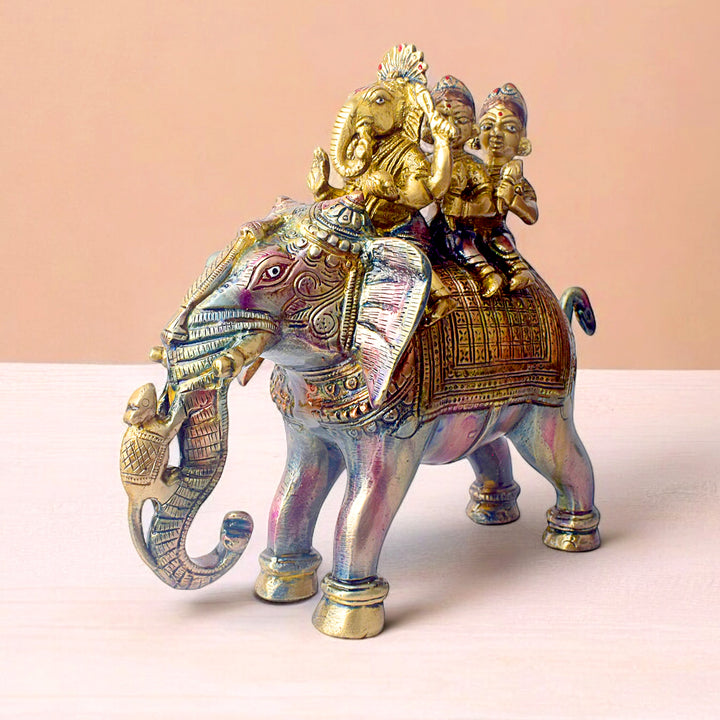8 Inch Brass Lord Ganesh Sitting On A Elephant Riding With Riddhi And Siddhi