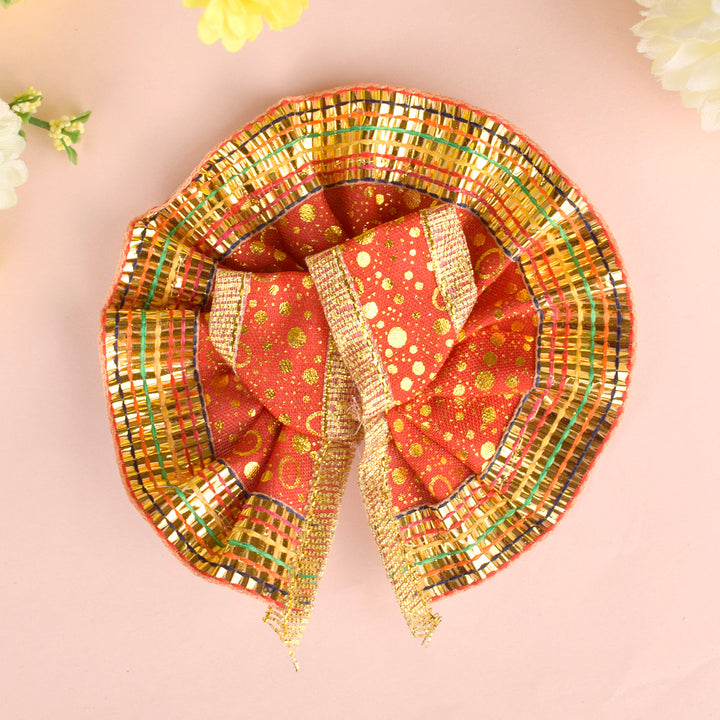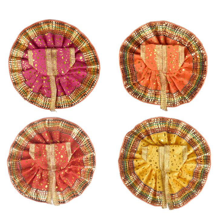 dotted laddu gopal dress | golden border krishna poshak | pink yellow red orange gopal dress | playful deity attire | vibrant laddu gopal clothes | festive pooja outfit | traditional bal gopal vastra | krishna ji dress online | dotted kanha ji dress | divine laddu gopal poshak | satvikstore.in