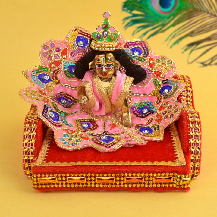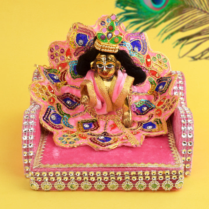 As you place your Laddu Gopal on this sacred throne, watch as the velvet embraces the little lord, showering blessings and grace upon your home. Its charming allure and captivating design make it a true centerpiece of devotion, adding a touch of splendor to your worship space.