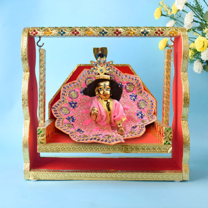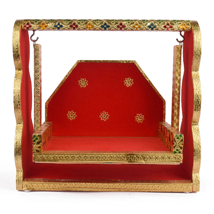 Infuse your worship space with divine elegance through this Red Velvet and Meenakari Jhula for Laddu Gopal. Crafted from sturdy wood, each jhula features plush red velvet accents and traditional meenakari detailing that enhance its regal charm.
