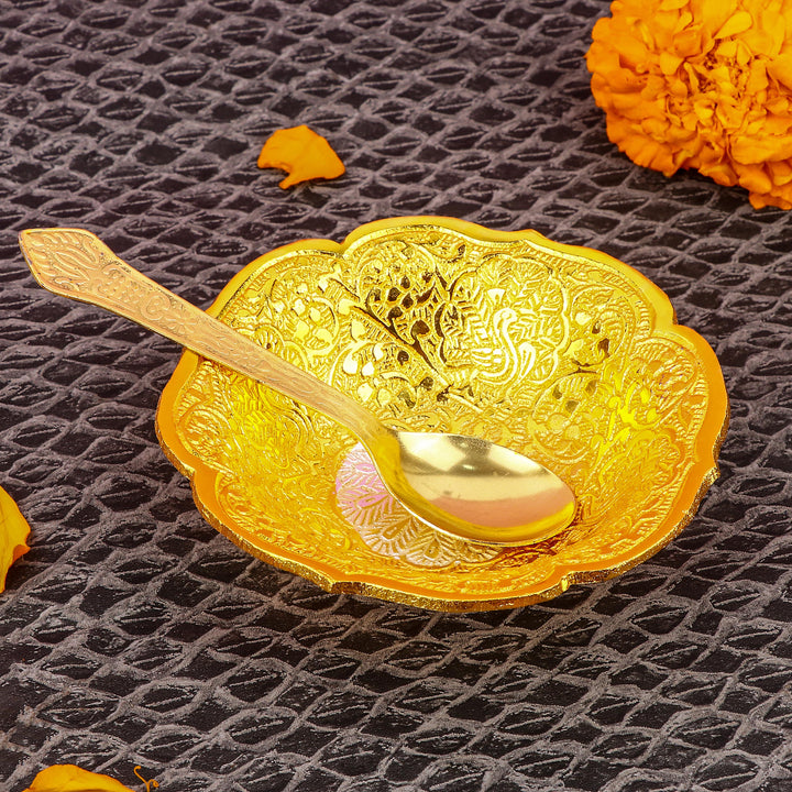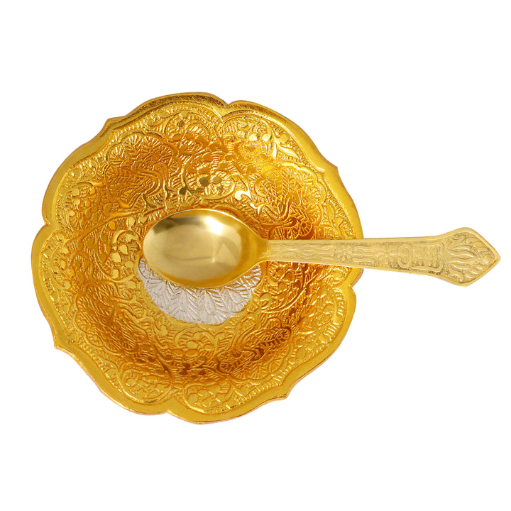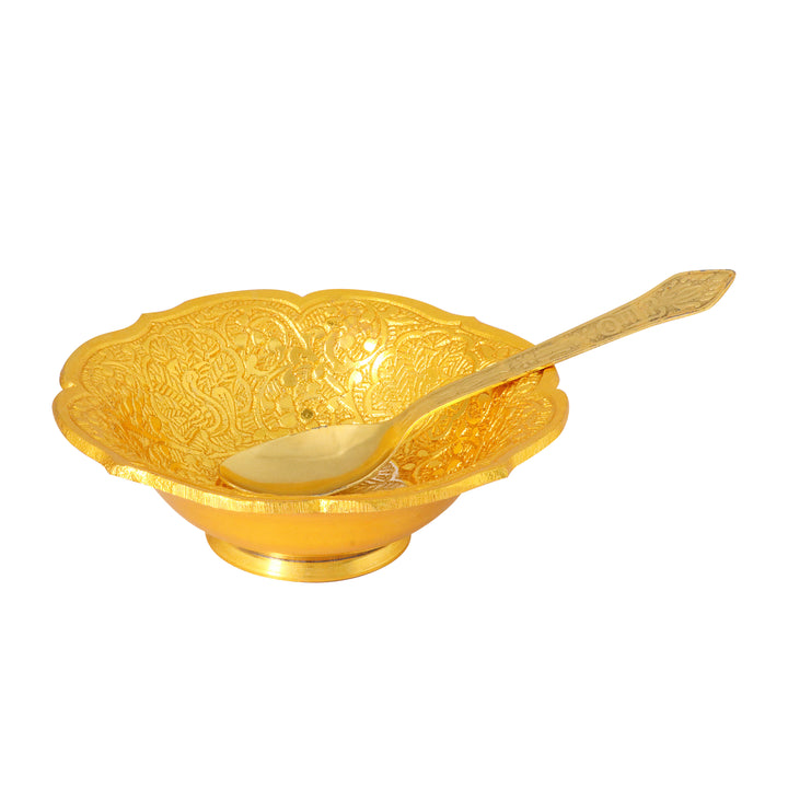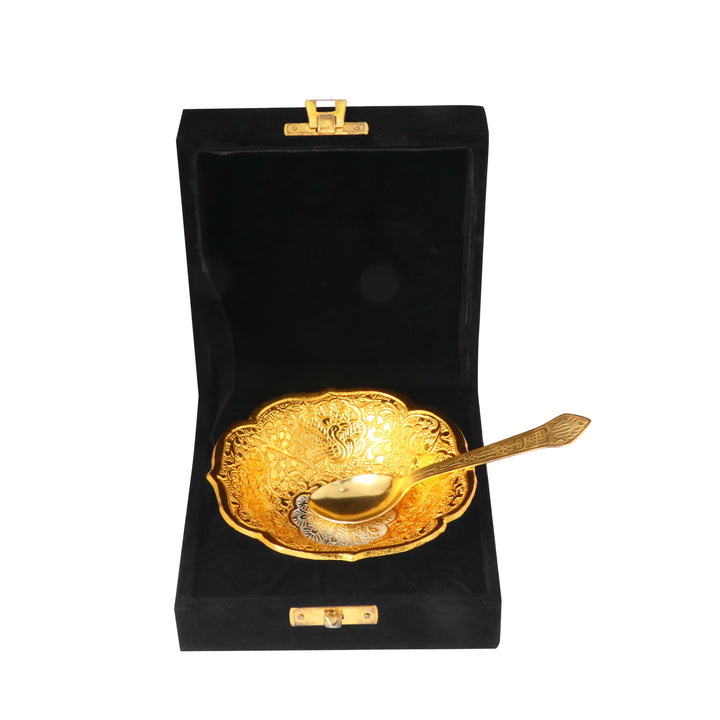 • Package Contains: 1 Pc Designer Embossed Bowl with 1 Spoon. This Set comes With Unique Royal Velvet Box Premium Gift Packing Set.