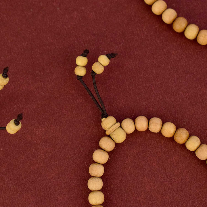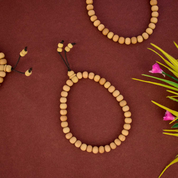 This White Chandan Bracelet is made from premium natural sandalwood beads, each measuring 8mm in size. It is delicately crafted to offer not just aesthetic elegance but also spiritual serenity and focus.