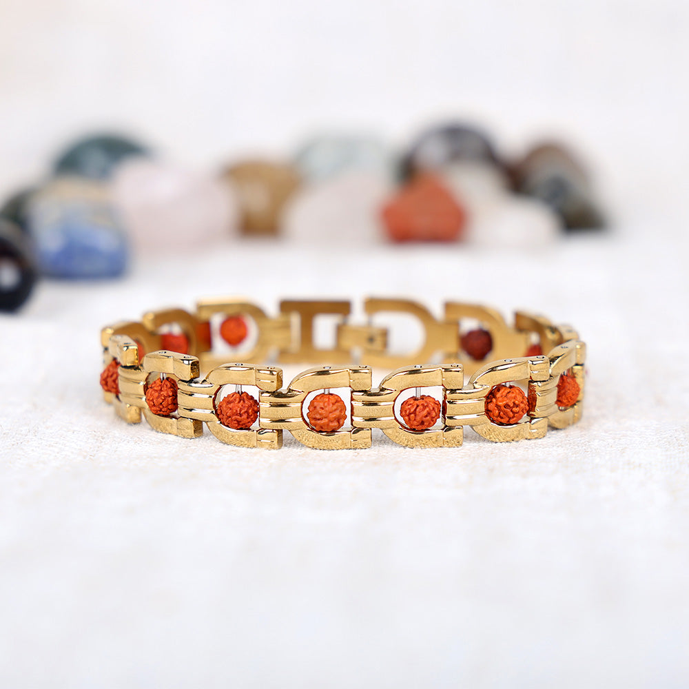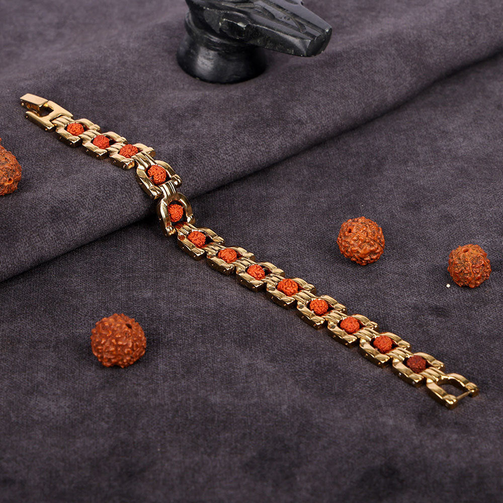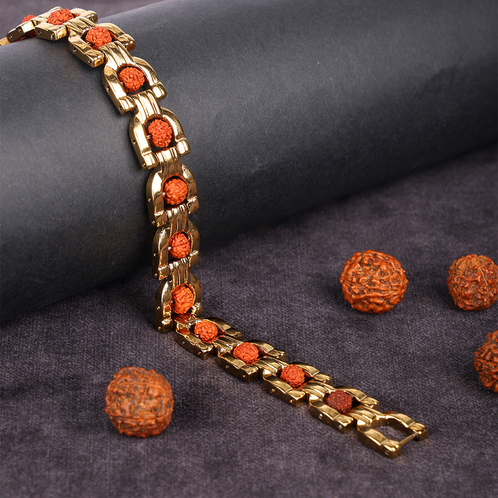 About Product: This Rudraksha Gold Plated Bracelet is a harmonious blend of spiritual tradition and refined elegance, crafted using natural Rudraksha beads combined with a rich gold IGP (Ion Gold Plating) finish. The advanced IGP coating enhances durability, resists tarnishing, and ensures a long-lasting radiant gold shine, making the bracelet suitable for both spiritual and daily wear.