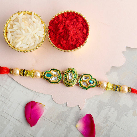 Kundan Rakhi: Bedecked with dazzling Kundan stones, our kundan rakhi collection epitomizes elegance and opulence. Celebrate the cherished moments and memories shared with your siblings.