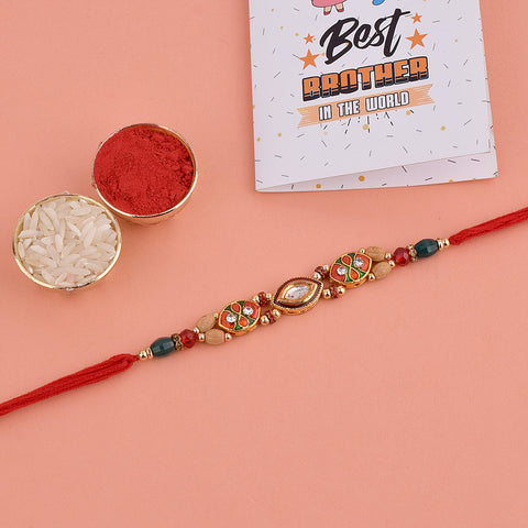 Beaded Rakhi: Adorned with intricate beads, our beaded rakhi collection exudes charm and elegance. Celebrate the joyous bond with your siblings as you tie these vibrant and delightful rakhis on their wrists.