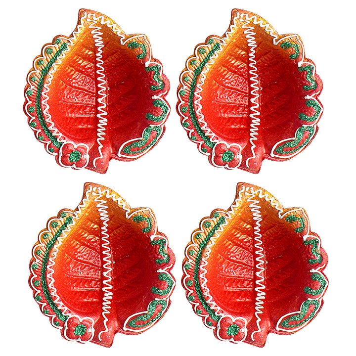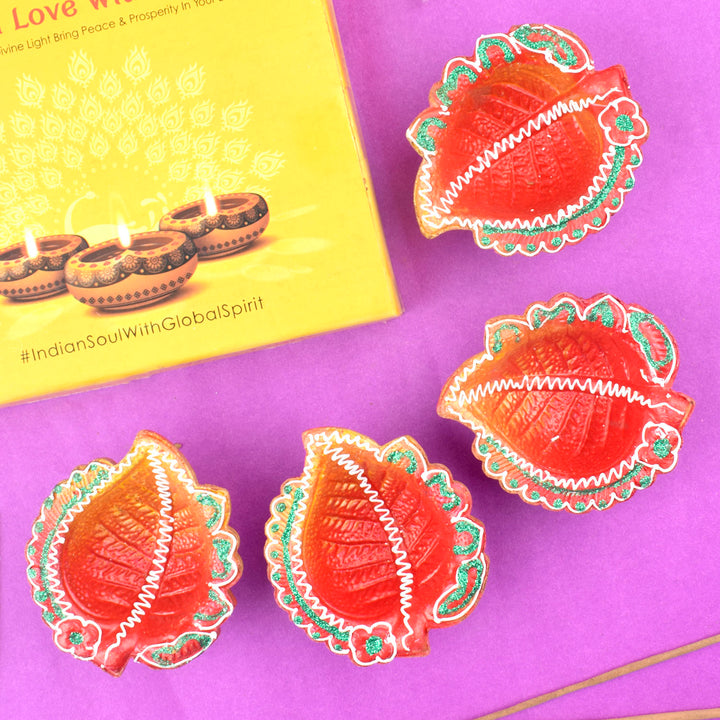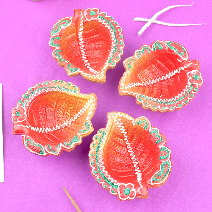 Leaf Design Celebrating Diwali with Clay Diyas Set of 4
