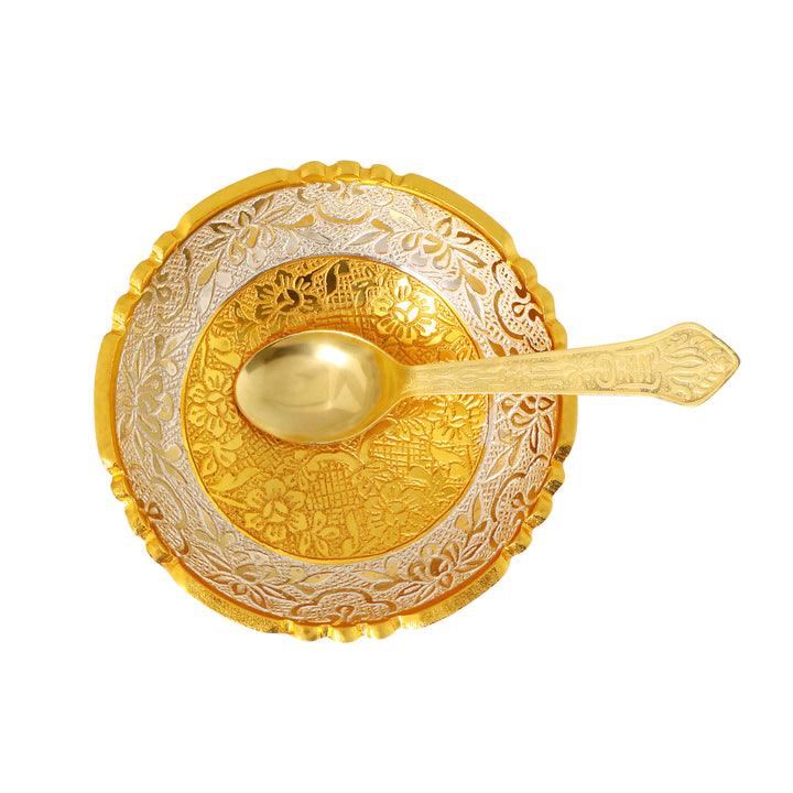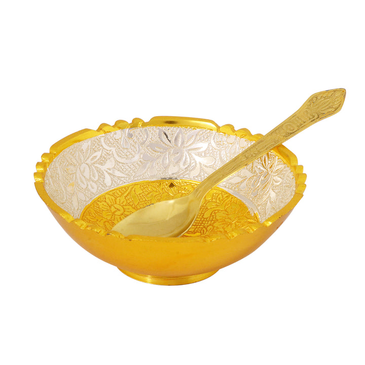 • Package Contains: 1 Pc Designer Embossed Bowl with 1 Spoon. This Set comes With Unique Royal Velvet Box Premium Gift Packing Set.