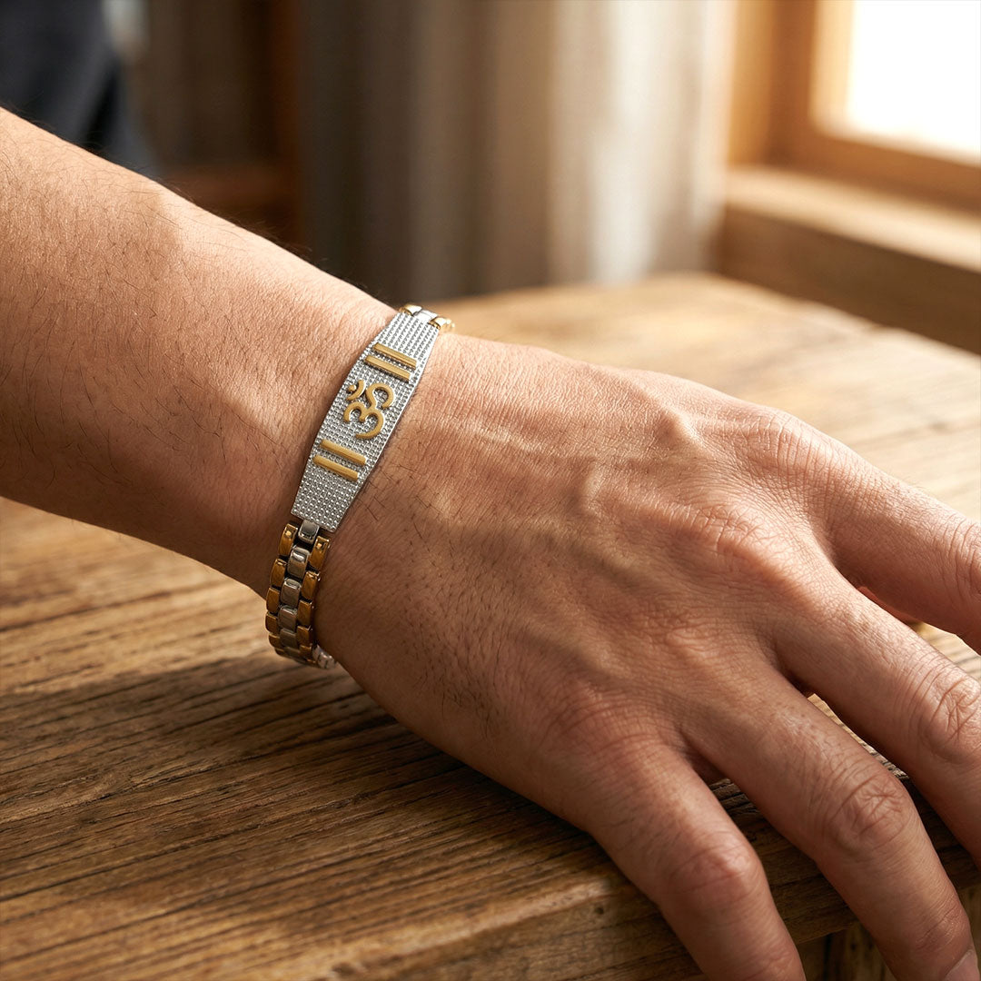 About Product: This Om Gold and Silver Plated Bracelet beautifully combines spiritual significance with elegant dual-tone craftsmanship, featuring the sacred Om (ॐ) symbol finished in refined gold and silver IGP (Ion Gold Plating) coating. The advanced IGP process enhances durability, offers resistance against tarnishing, and ensures a long-lasting radiant dual-tone shine.
