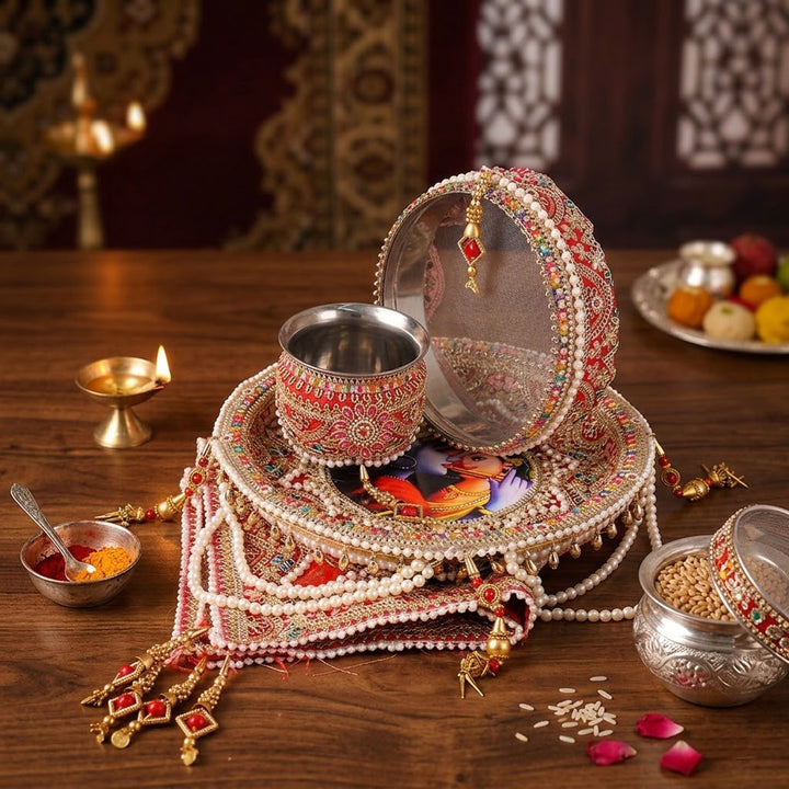Item Name: 11 Pc Elegant Red Embroidery Karwa Chauth Thali Set with Cover – Complete Puja Kit