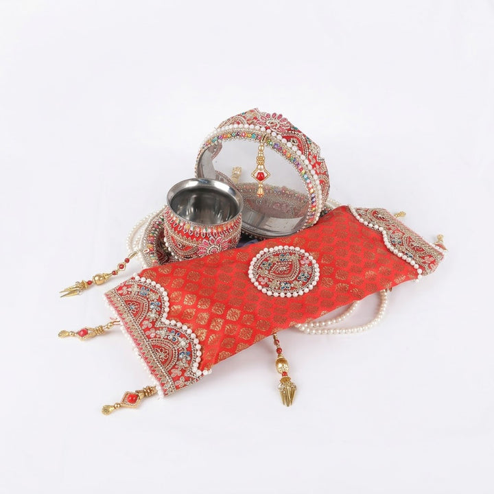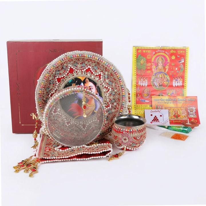 Buy 11 Pc Elegant Red Embroidery Karwa Chauth Thali Set | Satvikstore.in – satvikstore.in