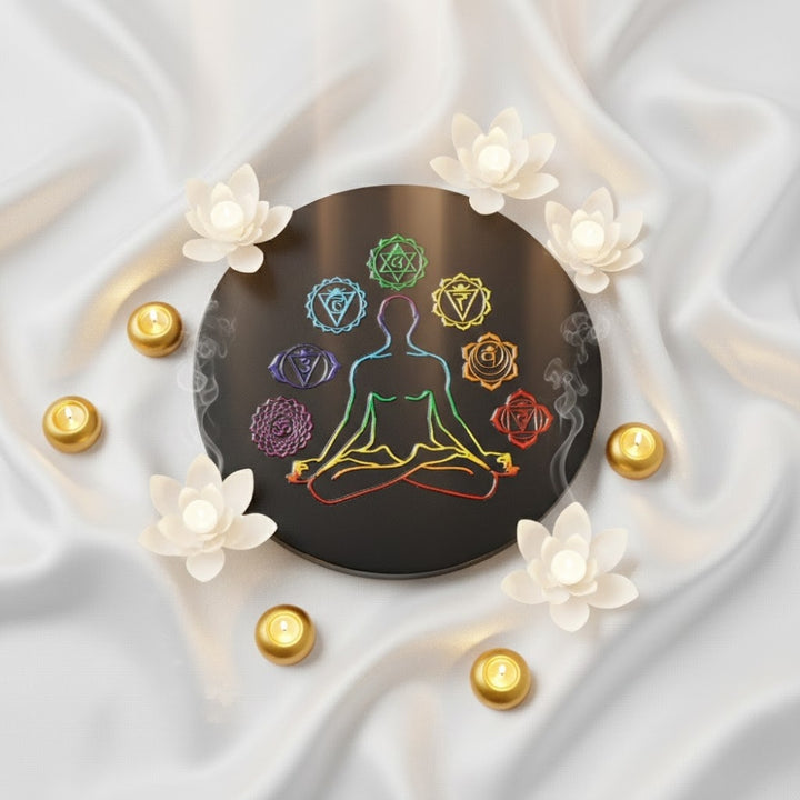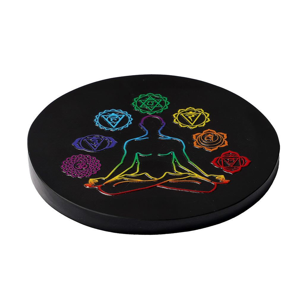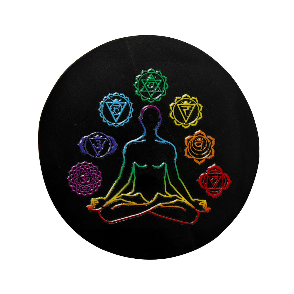 • Design: Seven Chakra Symbols Engraved on Polished Obsidian Plate