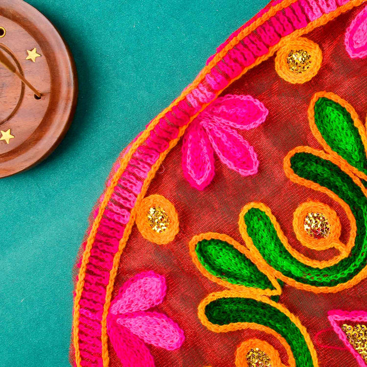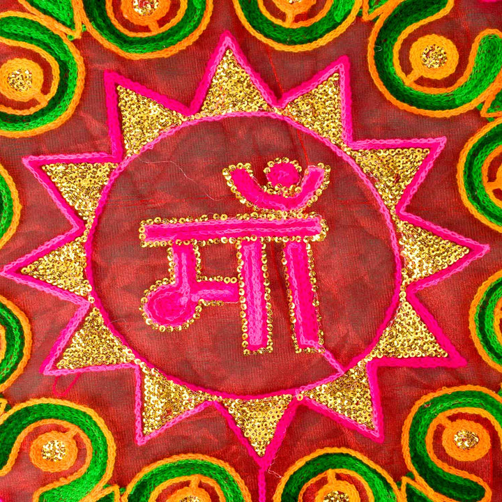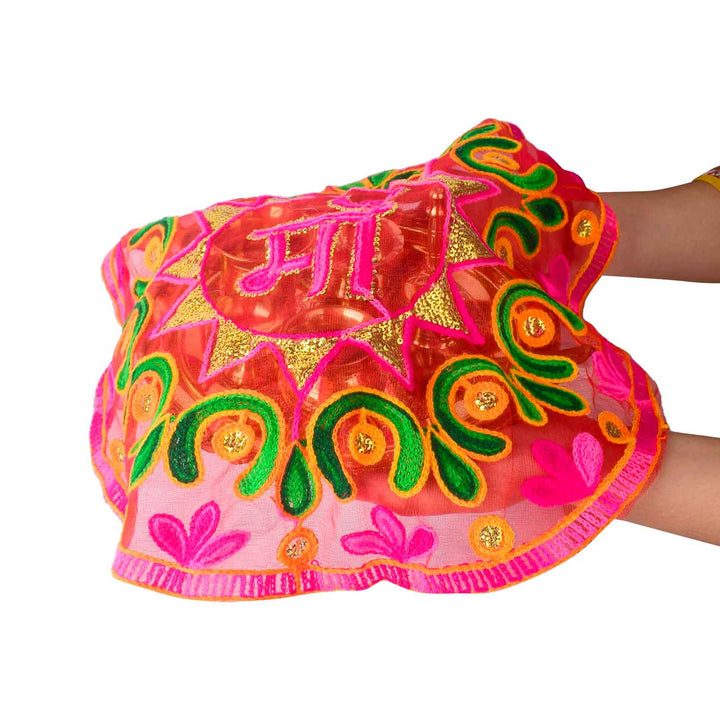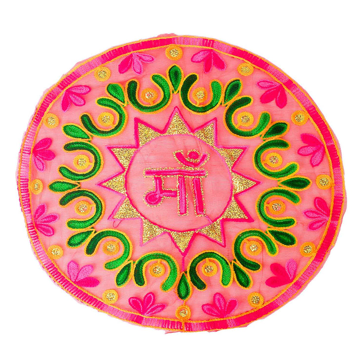 This beautiful pink Ma Thal Posh / Thali Cover is made from premium organza fabric and delicately embroidered with devotional motifs. Designed to enhance the grace of your pooja setup, it reflects devotion and festive elegance. Perfect for covering pooja thalis during Navratri, Durga Pooja, and spiritual events, this sacred cloth brings charm and purity to every ritual.