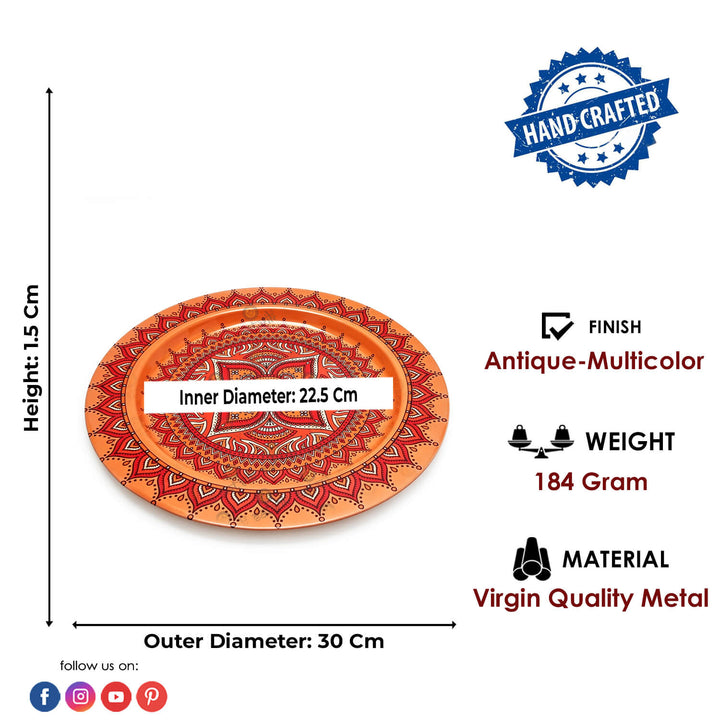 About Product: Best solution for Indian decor to add something unique to your home, the beautiful Hindu Puja Thali beautiful Copper thali design can easily be used as a display piece, even if you are not of the Hindu faith. For a bit of background, this piece is known as a thali, a traditional Indian serving tray. It may be filled with offerings and placed at a temple in a home as a part of puja or prayers. You can display the thali platter on a plate stand on a shelf or table and share some of the beauty and spirituality of Hindu religious practices with your friends and family.