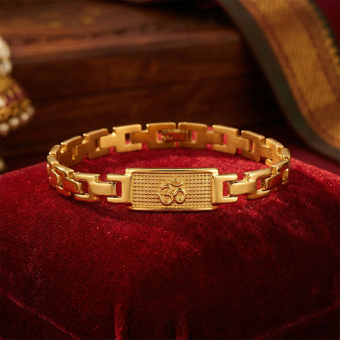 About Product: This Gold Plated Om Bracelet Beautiful is a refined expression of spirituality and elegance, designed with a beautifully crafted Om (ॐ) symbol and finished with premium IGP (Ion Gold Plating) coating. The advanced IGP process enhances durability, protects against tarnishing, and delivers a long-lasting radiant gold finish.