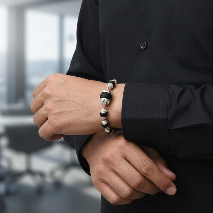 Karungali is revered in Siddha and Vedic traditions for its ability to absorb negative energies, protect against the evil eye, and stabilize the wearer’s aura. The bold central bead enhances the spiritual presence of the bracelet, while silver-plated accents add purity, calmness, and refined elegance.