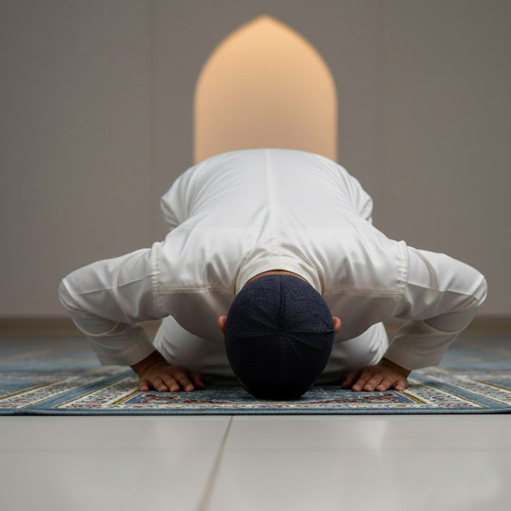 Wearing a Muslim cap during prayer symbolizes modesty, discipline, and spiritual focus, helping devotees maintain concentration and reverence while offering Salah.